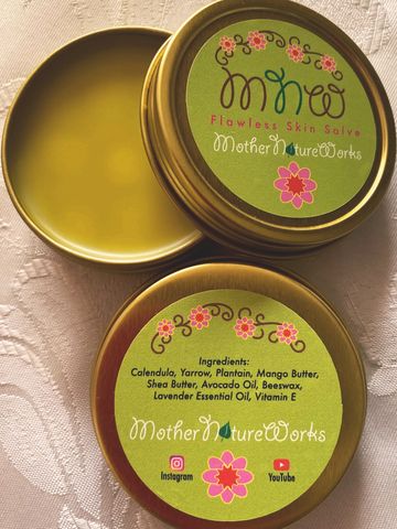 Here is a combination of some of the best herbs and essential oil for flawless skin. Calendula, Yarrow, Plantain, Mango Butter, Shea Butter, Beeswax, lavender Essential oil, Vitamin E